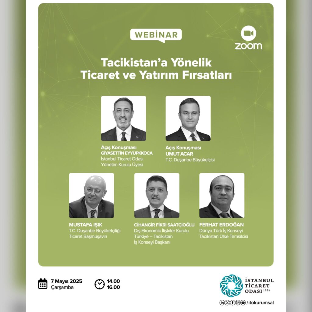 İstanbul Ticaret Odası tarafından düzenlenen “Tacikistan’a Yönelik Ticaret ve Yatırım Fırsatları” başlıklı webinar, 7 Mayıs 2025 Çarşamba günü çevrim içi olarak gerçekleşecek. Etkinliğin açılış konuşmasını, İTO Yönetim Kurulu Üyesi ve LASİAD Yönetim Kurulu Başkanımız Sn. Giyasettin Eyyüpkoca gerçekleştirecek. Tacikistan ile ekonomik ilişkilerin güçlendirilmesine yönelik bu önemli buluşmada, karşılıklı yatırım imkânları, ticaret potansiyeli ve stratejik ortaklık […]