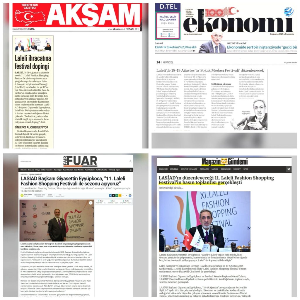 Festival Öncesi Basında Laleli! 11. Laleli Fashion Shopping Festival, henüz başlamadan ulusal ve uluslararası basında geniş yer buldu. Moda, ihracat ve ticaret dünyasının odağında olan Laleli; defile hazırlıkları, marka katılımları ve güçlü organizasyonuyla dikkatleri üzerine çekiyor. Basında çıkan her haber, sektörümüzün gücünü ve vizyonunu bir kez daha ortaya koyuyor.Festival heyecanı büyüyor, Laleli sahneye çıkıyor!