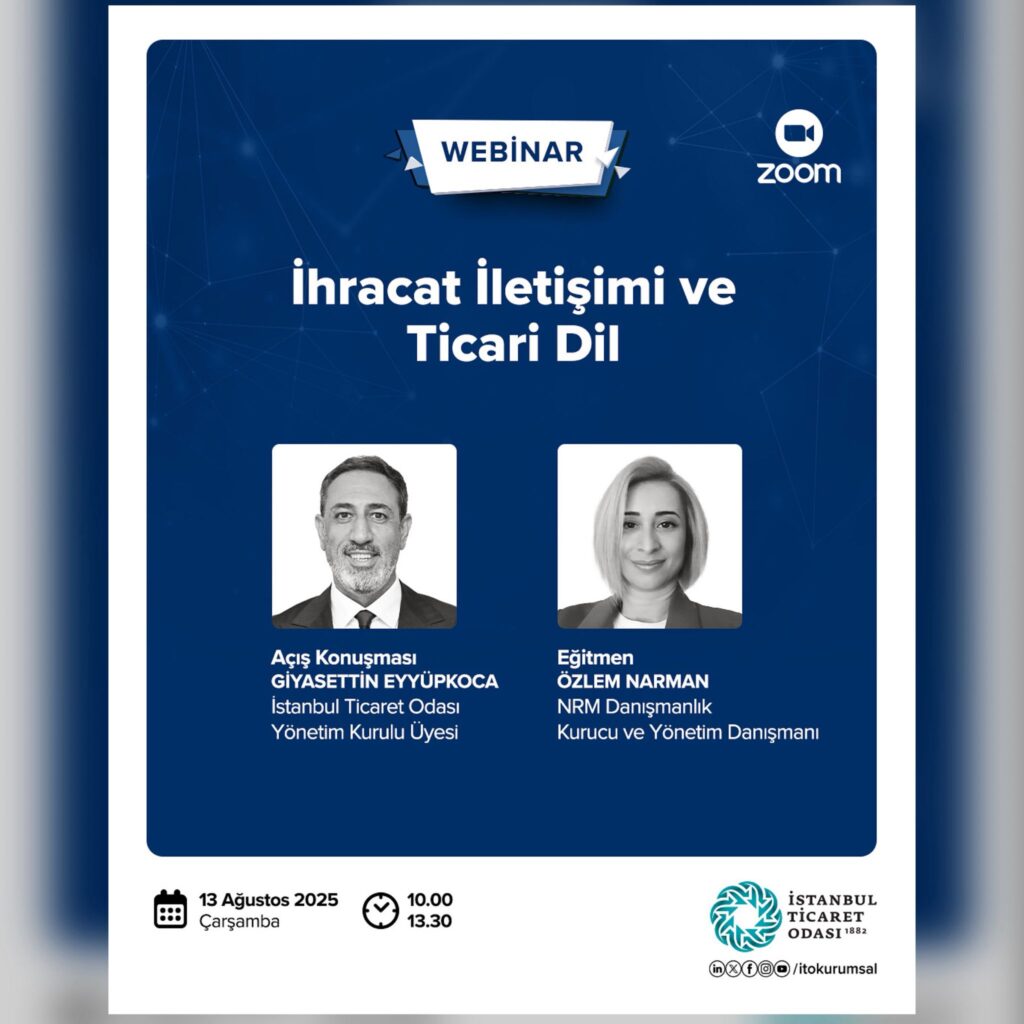 İstanbul Ticaret Odası tarafından düzenlenen “İhracat İletişimi ve Ticari Dil” başlıklı webinar, 13 Ağustos 2025 tarihinde zoom platformundan gerçekleştirilecek. Etkinliğin açılış konuşmasını, İTO Yönetim Kurulu Üyesi ve LASİAD Yönetim Kurulu Başkanımız Sn. Giyasettin Eyyüpkoca gerçekleştirecek. Tarih: 13 Ağustos 2025 Saat: 10.00 – 13.30 Platform: Zoom Detaylı bilgi ve kayıt için tıklayınız.