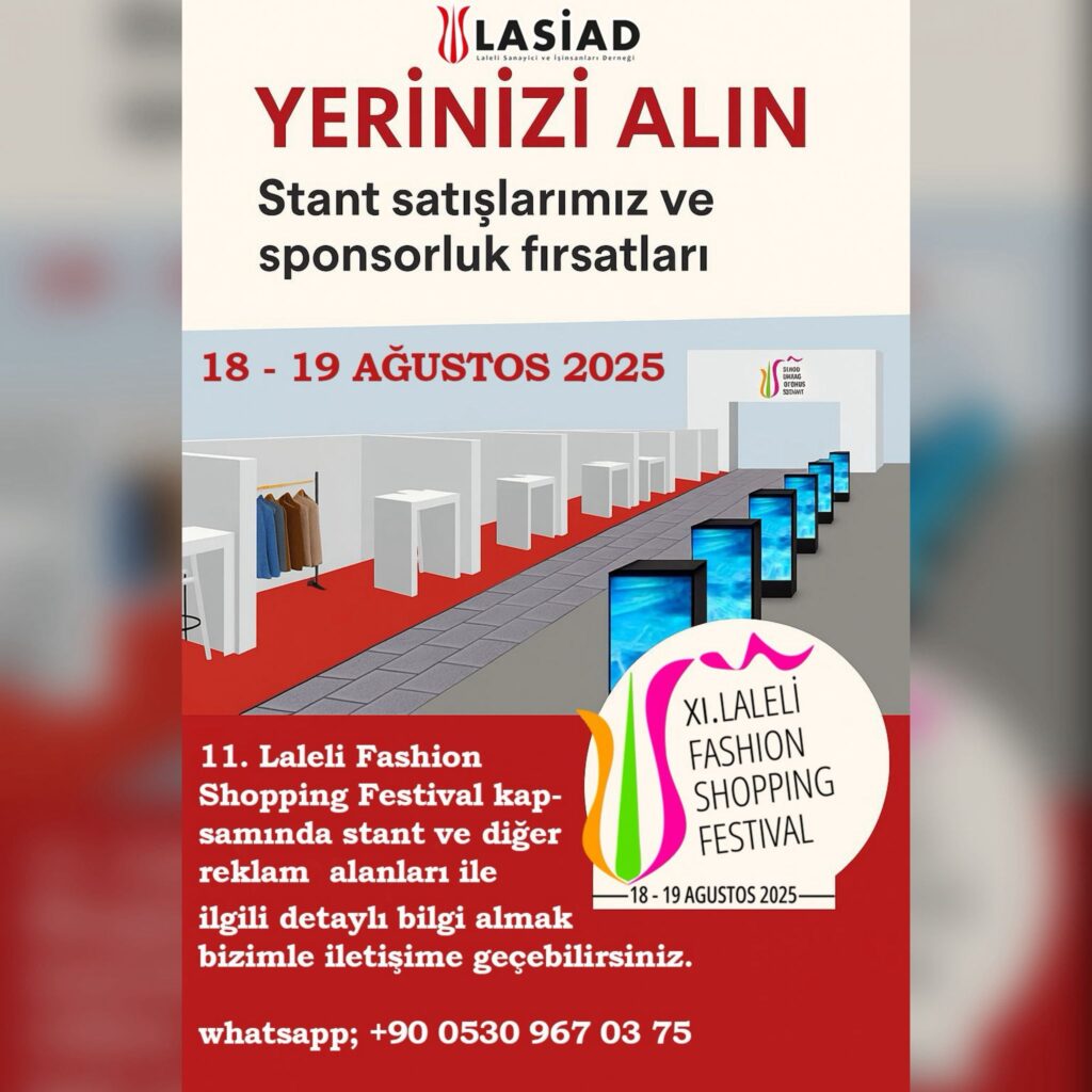 📍 11. Laleli Fashion Shopping Festival📅 18–19 Ağustos 2025 – Laleli / İstanbul 🔺 Stant alanları🔺 Açık hava defilesi🔺 Platin – Altın – Gümüş sponsorluk fırsatları 🌍 Laleli’yi birlikte dünyaya tanıtalım! 💼 Başvuru ve detaylı bilgi için:📧 lasiad@lasiad.org.tr📱 WhatsApp: 0530 967 03 75☎ 0212 516 90 52-53